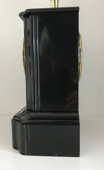 The black slate case with incised foliate line decoration, 4 inch enamel dial with gilt bezel with beveled glass, blued steel hands, Roman numeral white enamel dial with central moon phase display with a rotating Halifax moon dial and scale showing the age of the moon in days, signed 'Jolly a Laval'.