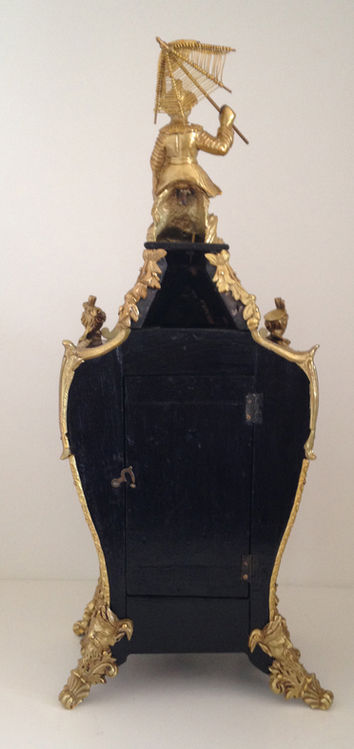 The swept bombe shaped case elaborately decorated with brass highlights and inlay with figures to the top corners and masked scrolled feet, surmounted by a seated figure of a Chinese gentleman carrying a parasol.