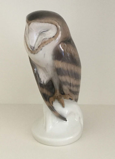 Royal Copenhagen Barn Owl porcelain figurine, marked to the base with the factory mark of 3 wavy blue lines and, in green, 'Royal Copenhagen Denmark'. Also, bears model number 273, the artists initials FG. The underscore to the letter G in Copenhagen indicates that this item was manufactured between 1969 - 1974.
